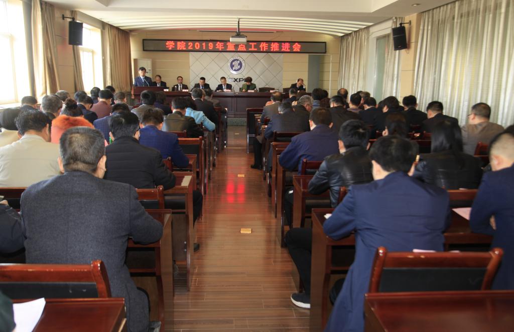 党委书记惠朝阳在讲话中指出,2019年是我院迎接新挑战、抢抓新机遇、谋求新发展的关键时期,“职教改革20条”的出台、高职招生规模扩大100万的任务、“双高校”申报、新校区建设都是我们的重大责任和光荣使命,全院上下必须下定决心、全力以赴、尽锐出战、力获全胜。