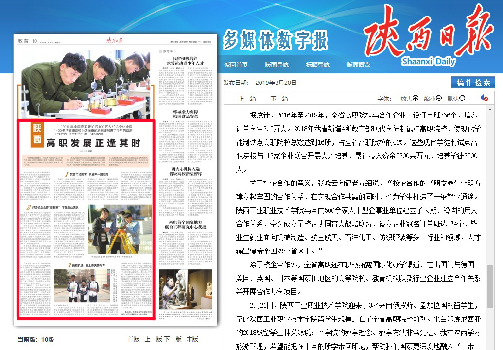 3月20日,《陕西日报》在其教育版刊发《陕西,高职发展正逢其时》的专题文章,大篇幅报道我院深化校企合作、推进校企协同育人、拓宽国际化办学渠道的办学实践和突出业绩。院长张晓云还就落实政府工作报告接受了记者的专访。