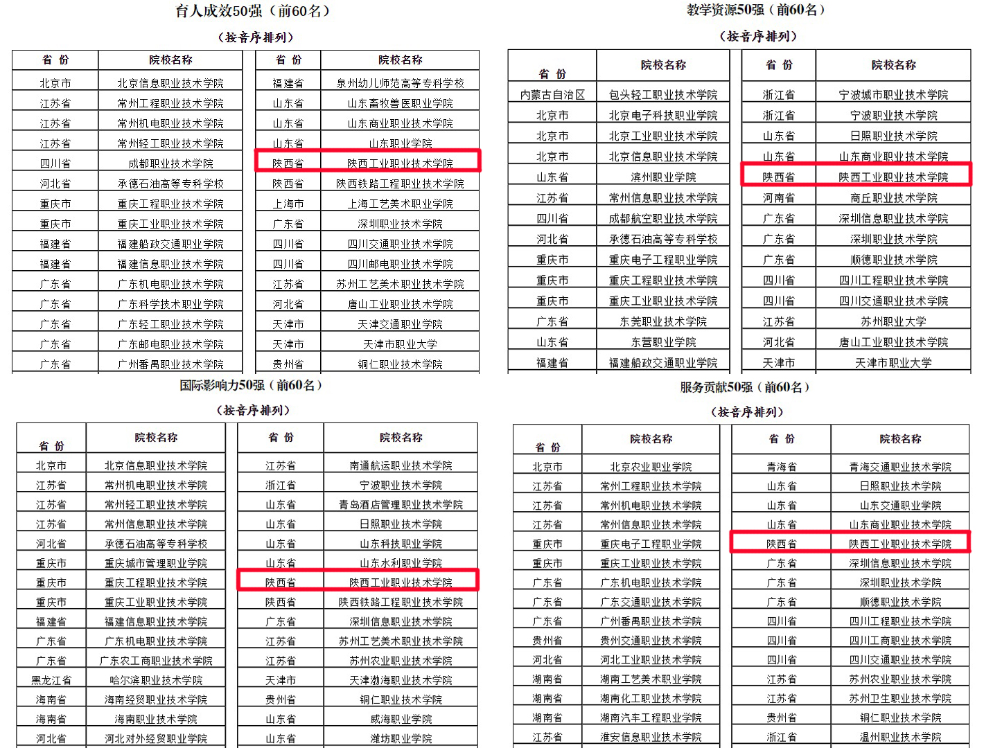 据了解,《中国高等职业教育年度报告》是由全国高职高专校长联席会议发布,以第三方视角,通过大量的数据支撑和案例,从多角度总结分析了中国高等职业教育人才培养质量的相关内容。报告自2016年开始发布“服务贡献50强”榜单,2017年开始发布“国际影响力50强”榜单,2018年开始发布“教学资源50强”榜单,今年又首次发布“育人成效50强”榜单。今年四项“50强”榜单的备选名单是在对各高职院校年报发布的相关数据进行分析的基础上,按照1:1.2的比例确定排名前60的院校入围,全国仅有8所、陕西仅有1所院校入围全部四项榜单。我院还先后荣获2017年“服务贡献50强”、2018年“教学资源50强”。