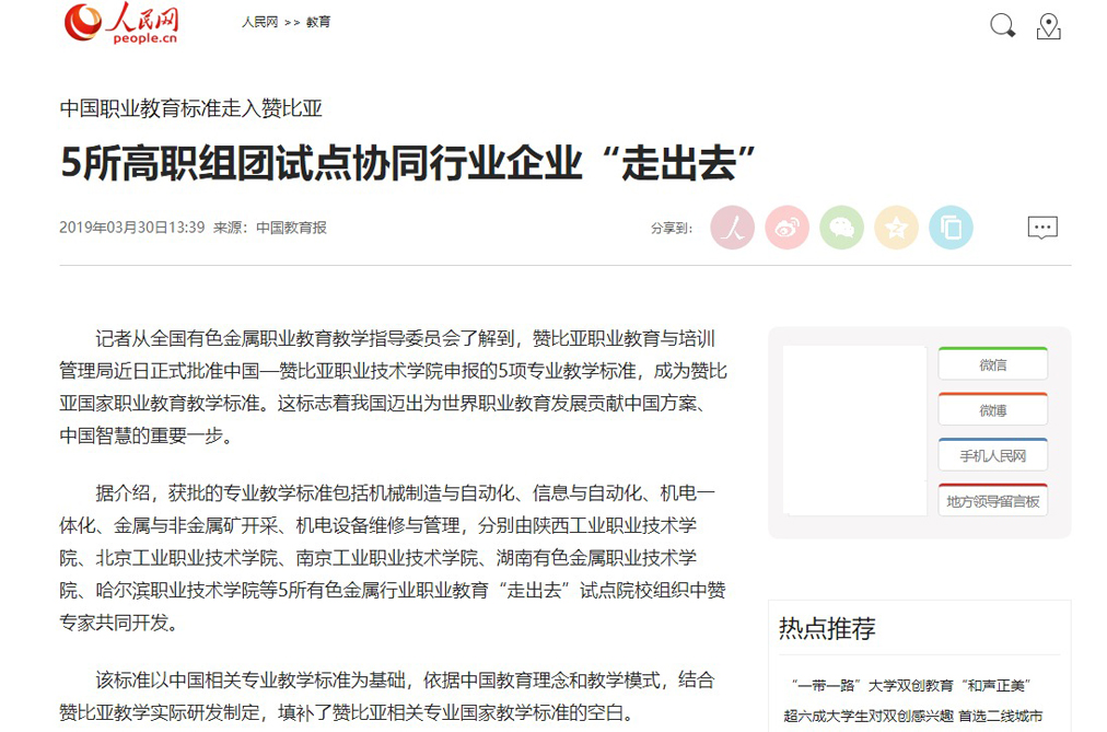 近日,人民网、《中国教育报》等媒体聚焦报道中国-赞比亚职业技术学院获得赞比亚批准,由我院牵头制定的机械制造与自动化等5项中国职业教育标准正式成为该国官方标准。这也是我院在建设国家优质、陕西一流,争创“双高”高职院校进程中,为世界职业教育发展提供的工院方案,贡献的工院智慧。全文链接如下: