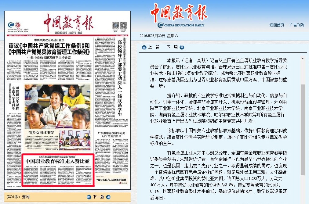 “我们认为,可以利用我国职业教育资源来解决企业遇到的问题。”宋凯说,“经教育部批复同意,我们从2015年开始在中色矿业集团赞比亚企业开展有色金属行业职业教育‘走出去’试点,并筹建中国—赞比亚职业技术学院。”