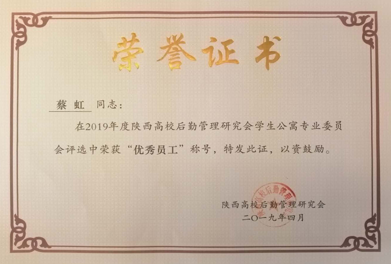 4月12日,陕西高校后勤管理研究会学生公寓专业委员会2019年年会在汉中举行。我院学生处公寓管理中心荣获陕西高校学生公寓“先进集体”,公寓管理中心齐智同志获陕西高校学生公寓“服务标兵”、蔡虹同志获陕西高校学生公寓“优秀员工”称号。