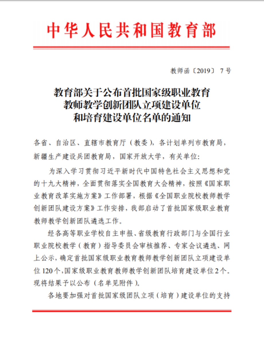 日前,教育部发文(教师函〔2019〕7号),公布了首批国家级职业教育教师教学创新团队立项建设单位名单,我院申报的“机电一体化技术”教学创新团队通过评审,入选首批国家级职业教育教师教学创新团队立项建设单位。