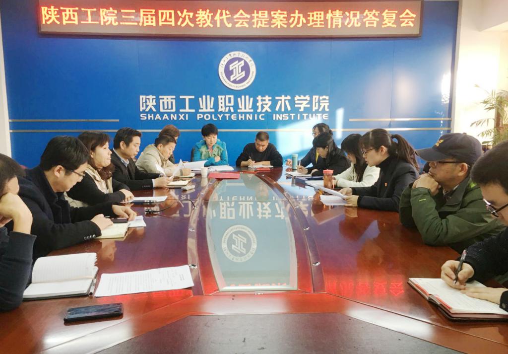 12月4日下午,学院三届四次教代会提案办理情况答复会在崇文楼第三会议室召开,院工会负责人张彬、教代会提案审查落实委员会全体委员、提案及附议人、提案承办部门负责同志参加了会议。党政办公室副主任赵娇主持会议。