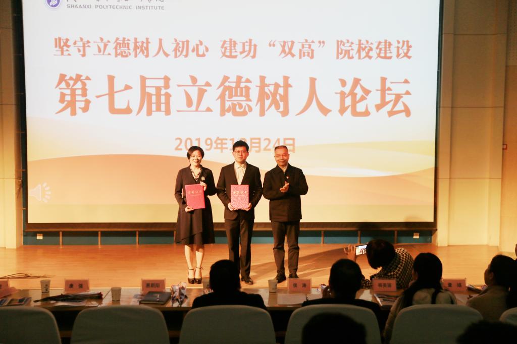 12月24日下午,我院2019年“立德树人”论坛在学术会堂举行。十四位嘉宾以优秀教育工作者、一线教师、管理人员和辅导员的身份,围绕“坚守立德树人初心 建功‘双高’院校建设”的主题分享了自己在践行“立德树人”过程中的感想与收获。党委书记惠朝阳、纪委书记康强、党委副书记贺天柱、党委副书记田昊与400余名师生现场观摩了比赛。陕西省优秀共产党员、陕西省教育系统“我身边的好老师”侯涛,连续九年担任我院欧姆龙订单班班主任顾建林,陕西省普通高等学校优秀辅导员桓美丽,陕西高校思政课教学标兵董娟,陕西省职工演讲比赛铜奖获得者梁晓哲担任评委。现场活动还通过搜狐在线、QQ平台、学院官方抖音同步开启网上直播,实现线上线下,场内场外同步观看,实时互动。