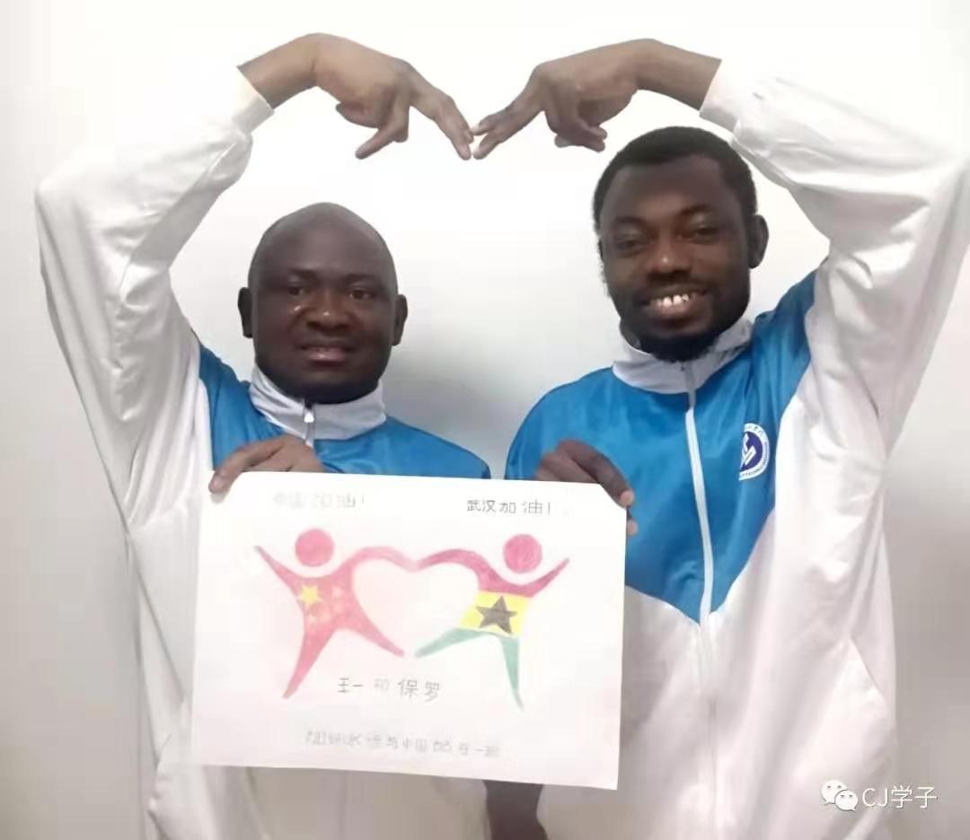 学院的留学生也密切关心着中国的疫情,并用他们自己的方式抒发着对中国的深厚感情,为中国加油打气。来自加纳的王一和保罗以两国国旗为元素进行了绘画创作,通过图中牵手、比心的卡通形象,表达了他们对中国的支持和热爱。
