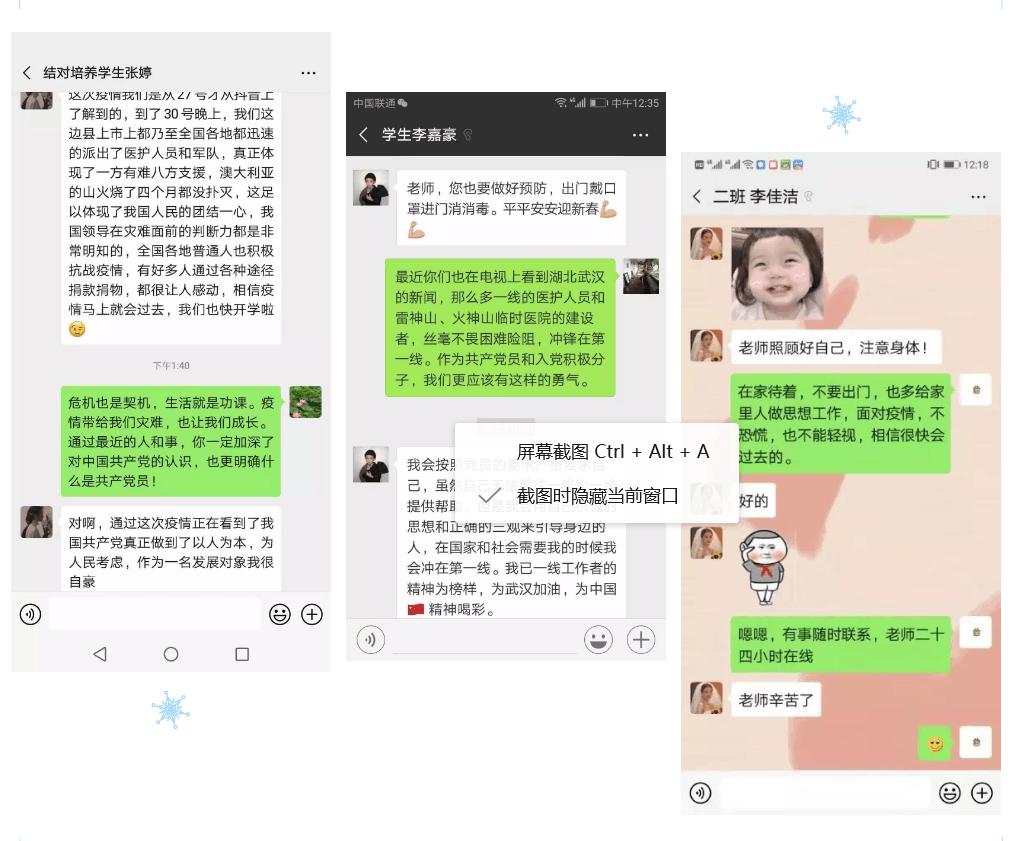 在这特殊时期,各位教师党员依旧坚持对结对学生作好学生思想工作和培养考察工作,引领学生不断成长。