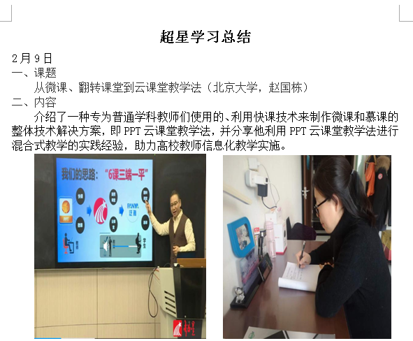 本次培训从技术先导课、综合提升课、重点突破课、示范指导课四个主题重点解决教师如何基于“一平三端”进行备课、用课、学课、管课等问题,及线上教学设计与教法示范教学。财经与旅游学院全体教师学习过程中边学边做笔记,分别从教学模式、课程设计、课程思政、教学评价等方面对教学进行认真思考、总结,并写出个人学习感想。