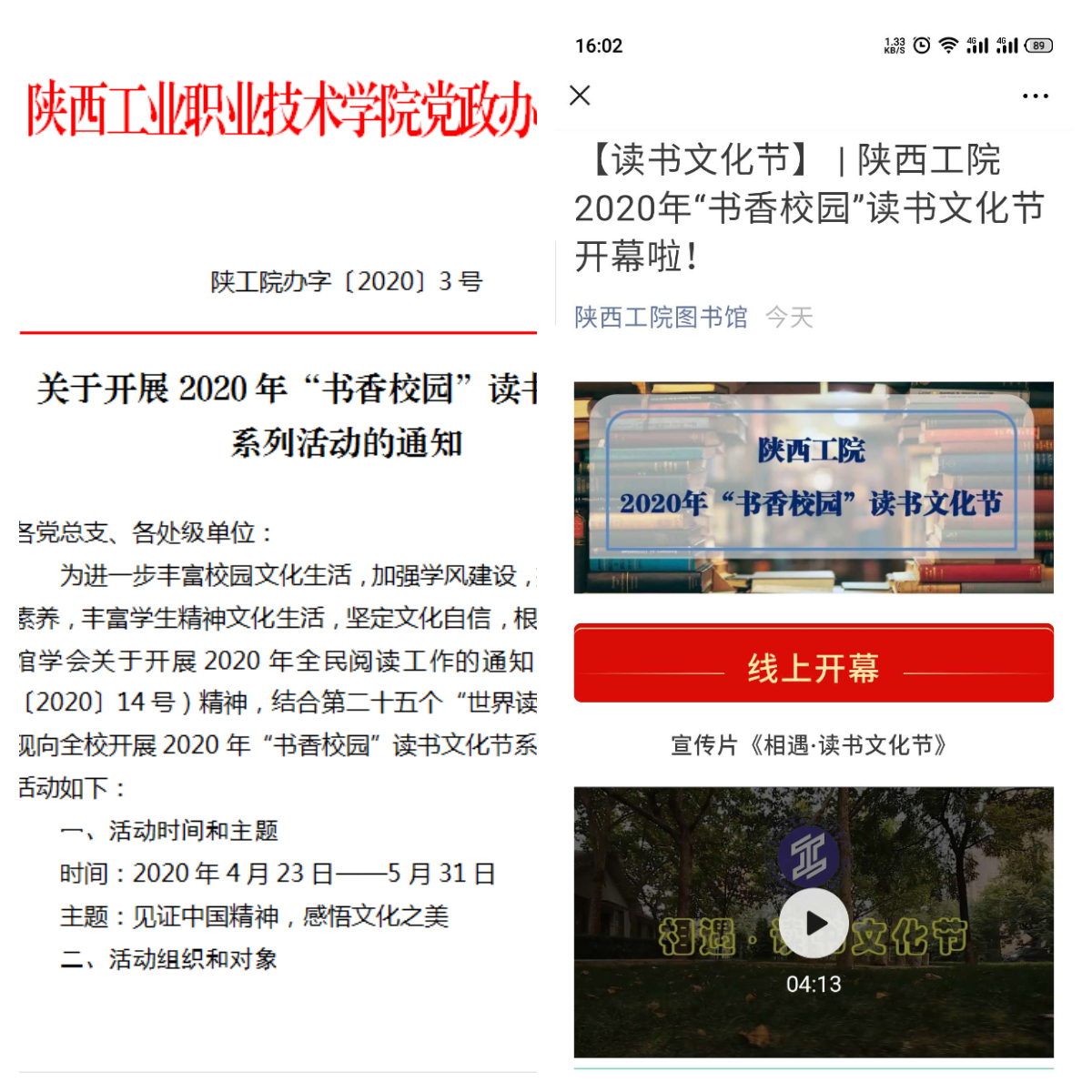 与往届相比,本届读书文化节最大的亮点是结合防控疫情特殊形势,首次采用“云”开幕的形式,启动线上系列“悦读悦听悦阅览,码上行动”创意阅读推广活动,图书馆馆长高凤香、副馆长王丁、馆办主任蒋鹏协同图书馆教职工共同录制开幕式宣传片《相遇·读书文化节》。该片从陕西工业职业技术学院取景,在展示校园风景的同时,开启2020年阅读新风尚。4月23日,题为《相遇·读书文化节》的宣传片及“拍摄花絮”通过“陕西工院图书馆”微信公众号与观众见面,引起广大师生的强烈共鸣!