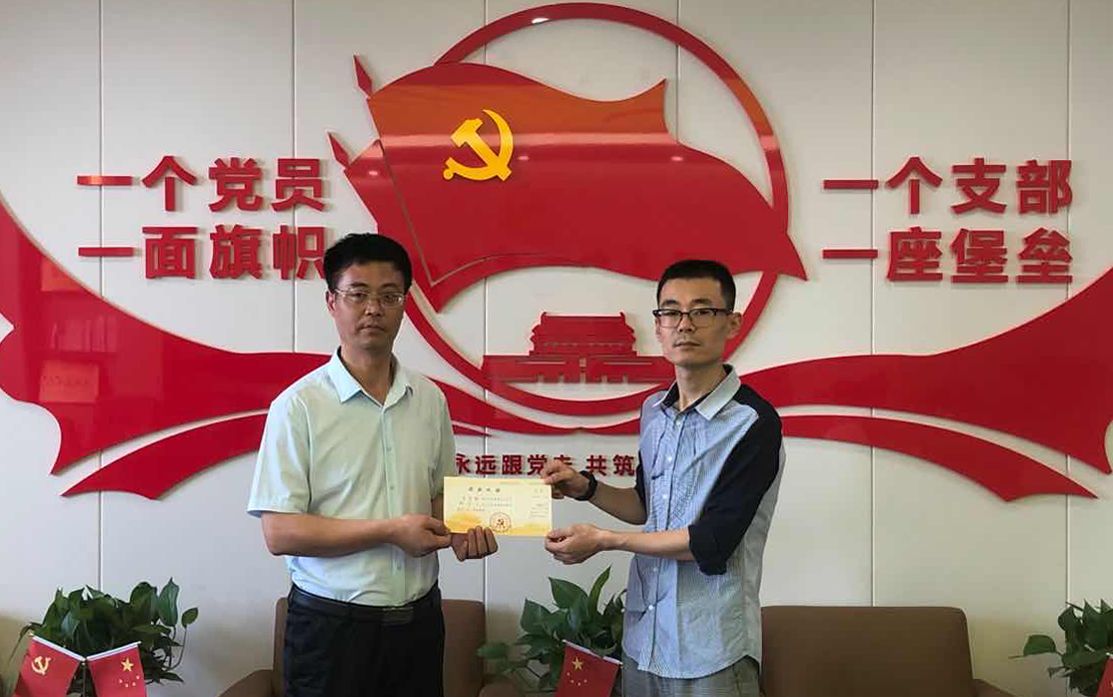 机关第一党总支书记王超联为支部党员颁发捐款收据