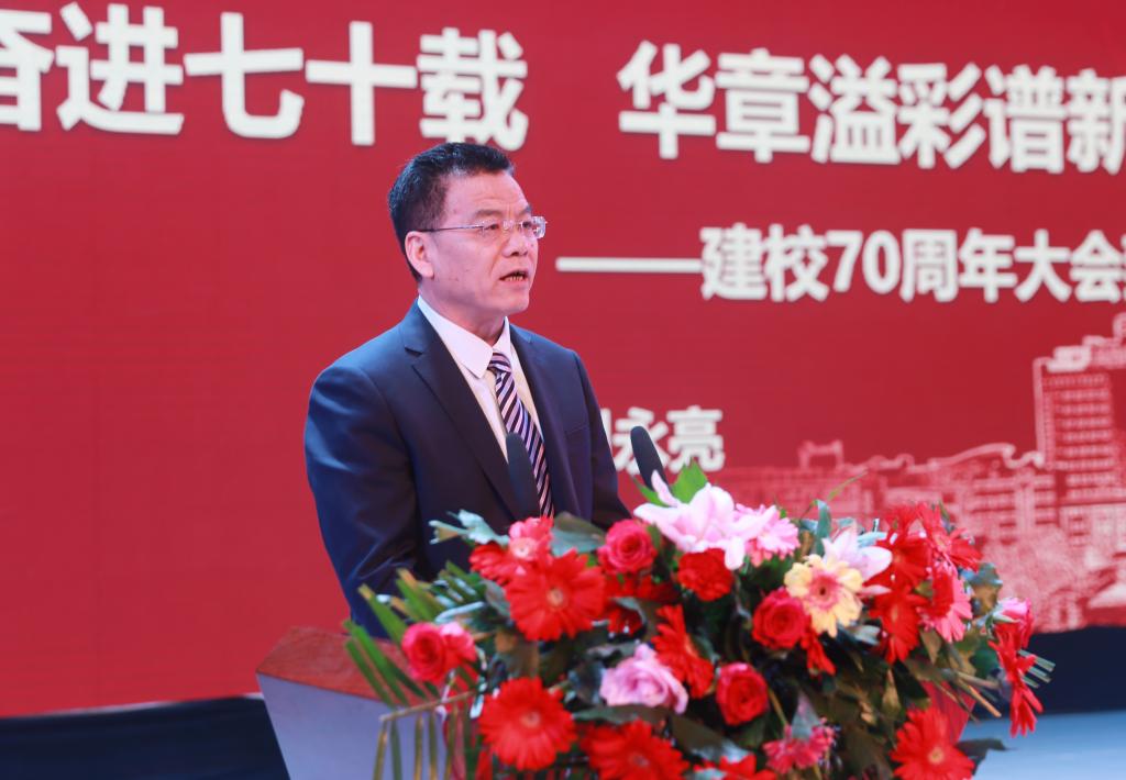 在激昂的国歌声后,学院院长刘永亮同志以《砥砺奋进70载,华章溢彩谱新篇》为题致辞。他首先代表全院25000余名师生员工,向各位领导、嘉宾的到来表示最热烈的欢迎;向为我校创新发展提供坚强支撑的各级政府、行业和企业表示衷心的感谢;向长期以来关心、支持学院发展的省内外兄弟院校和社会各界朋友致以最崇高的敬意;向坚守在岗位默默奉献的海内外15万校友致以节日的问候;向70年奋斗不息、爱岗敬业的学校教职工,以及为学院发展做出突出贡献的历届老领导、老教师致以最衷心的感谢。