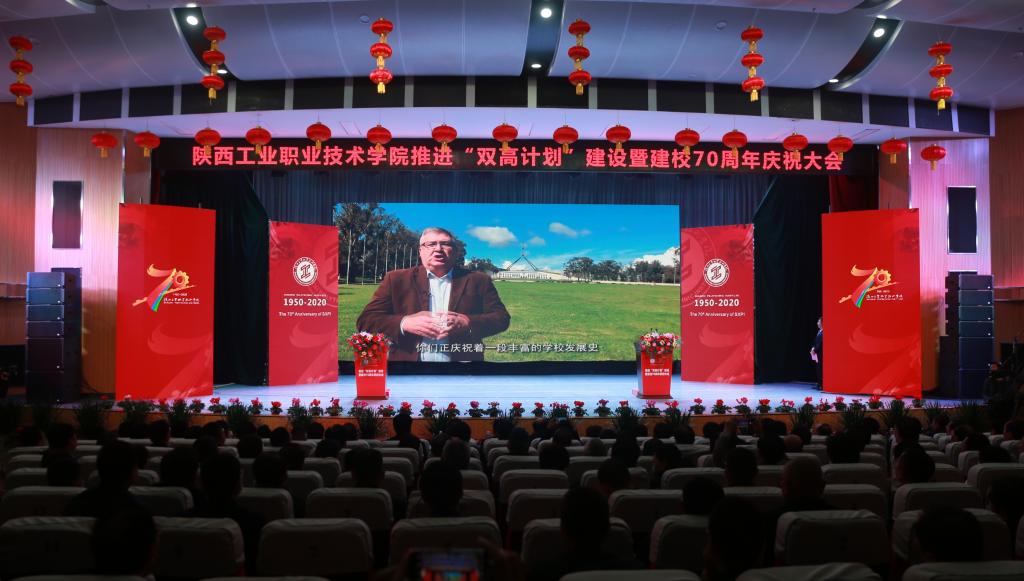 合作企业代表——西安航天发动机有限公司党委书记郭新峰表示,公司多年来携手陕西工院培养了一大批能工巧匠,真正实现了校企双方的深度融合,陕西工院70年华诞也是航天发动机公司与学院推动下一个合作的新起点,在今后的合作中将进一步聚焦人才培养的关键领域和中心环节,携手创新,培养出更多能助力我国装备制造业走向世界产业高端的,具有国际一流水平的时代工匠。兄弟院校代表——四川工程职业技术学院党委书记司徒渝,希望在未来的发展中,两校进一步加强合作交流,与各兄弟院校携手并进、共谋发展,共同为国家“职教兴国”和“人才强国”战略的实施,为我国高等职业教育的发展做出新的更大的贡献。优秀校友代表——中国船舶重工集团公司第十二研究所党委书记赵峰彦,感谢母校的培养与关爱,作为校友将在自己的工作岗位上作出新的更大的贡献,并一如既往的关注支持母校的发展,用炙热之情和不懈努力回报敬爱的母校,回报深情的老师。我院优秀教师代表——全国教书育人楷模、全国师德标兵卢庆林教授,号召全体教师奋进努力,献身职业教育事业,投身科学研究,努力传承文化创造知识,积极参与学校管理,以培养高素质技能型人才为己任,在陕工70年辉煌的基础上续写新的华章。国际合作教育机构代表——世界职业教育院校联盟主席克雷格·罗伯逊先生,也以视频的形式对我校建校70周年表示祝贺,对双方未来的合作交流提出美好期许。