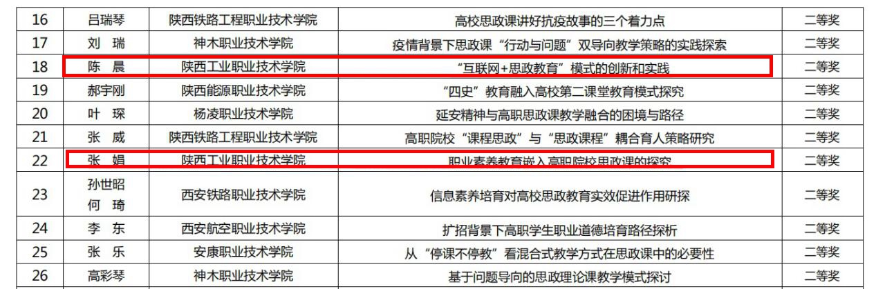 根据陕西省职教学会近日公布的思想政治理论课教育教学指导委员会征文评选结果,在“贯彻习近平来陕考察讲话精神,推进新时代高职思政课改革创新”主题征文活动中,我院马克思主义学院董娟老师的《“抗疫故事”与思政教学的精准对接》和陈杜昊老师的《新时代立德树人背景下工匠精神的内涵与价值研究》分别荣获主题征文活动一等奖;陈晨老师的《“互联网+思政教育”模式的创新和实践》和张娟老师的《职业素养教育嵌入高职院校思政课的探究》分别荣获二等奖;我院获评主题征文活动优秀组织奖。