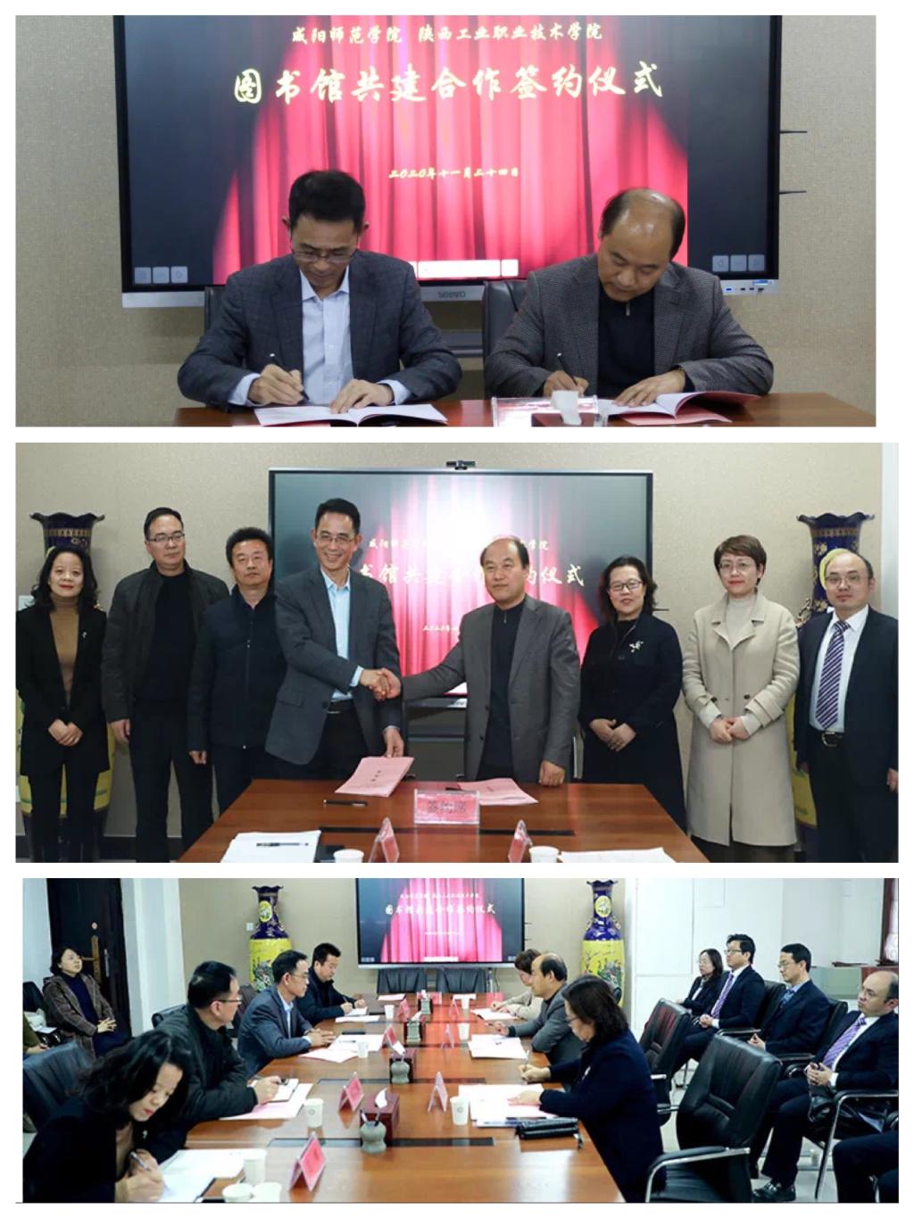 11月24日,我校与咸阳师范学院签署图书馆共建合作协议仪式隆重举行。我校副校长梅创社、咸阳师范学院副校长毛龙灿出席仪式,并代表双方签约。我校图书馆馆长高凤香、副馆长王丁、办公室主任蒋鹏及部分馆员代表与咸阳师院图书馆馆长张卫军、党政办副主任田立强、副馆长王倩及相关老师共同见证了协议签署。签署仪式在咸阳师范学院举行,由咸阳师院图书馆馆长张卫军主持。