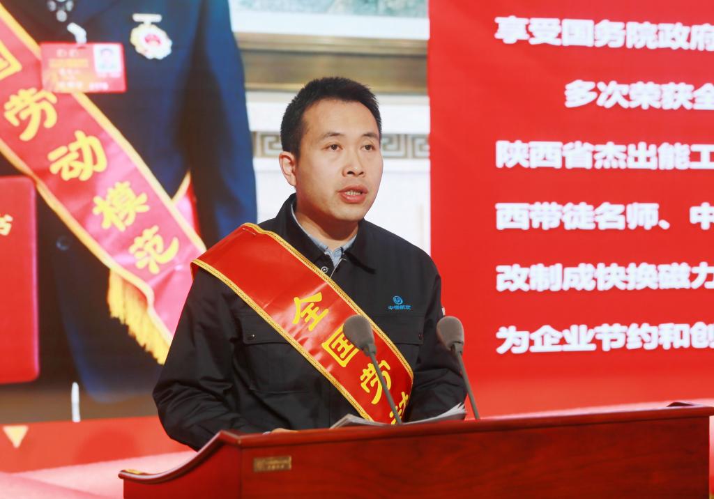 全国劳动模范、三秦工匠、中国航发西安航空发动机有限公司工具厂53车间二工段工具钳工班组组长夏复山作报告
