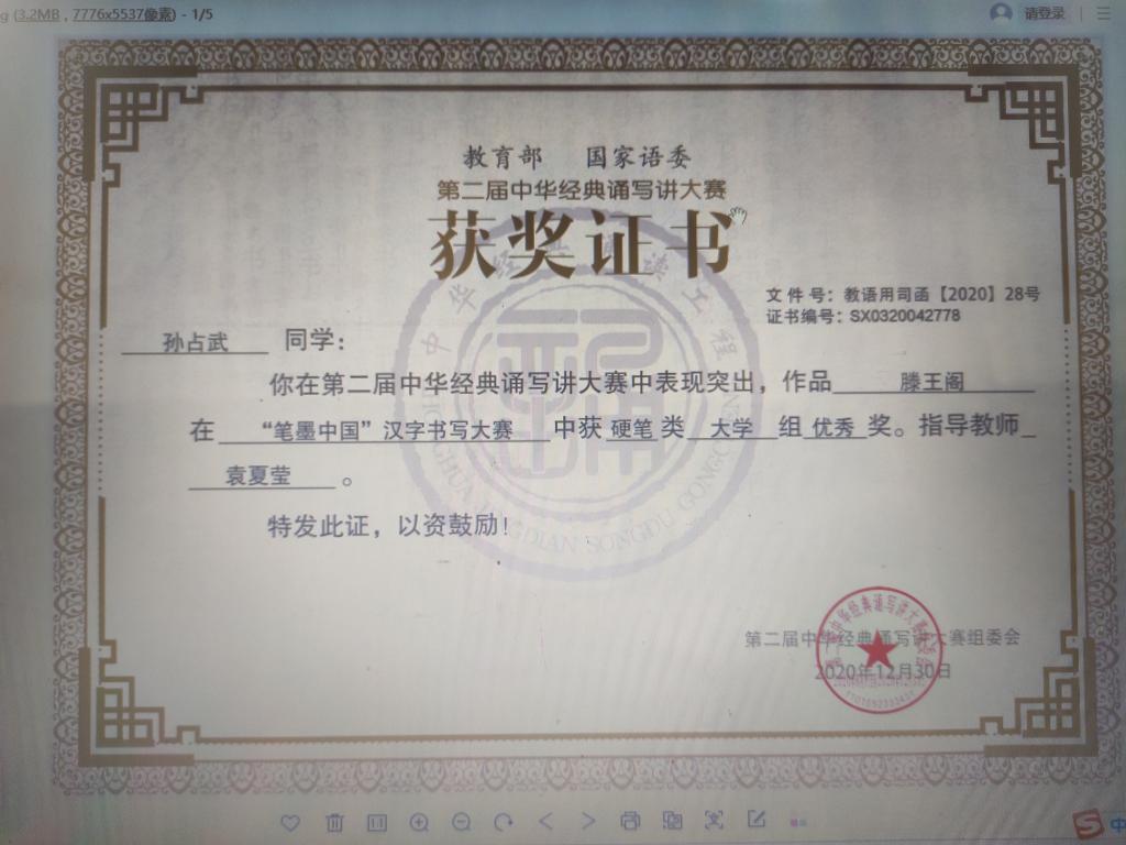 2020年5月,根据教育部办公厅印发《关于举办第二届中华经典诵写讲大赛的通知》精神,学工部、美育部、大学生艺术团积极组织,辅导学生朗诵、书法作品参加,通过网上报名、专家评选,孙占武同学的硬笔书法作品《滕王阁序》参加“笔墨中国”汉字书写大赛大学组硬笔书法比赛,最终入围全国决赛。陕西省大学组共15件硬笔书法作品入围全国决赛,最终7件作品获奖,其中三等奖四名,优秀奖三名。由赵嘉豪、赵四妍、党东旭、李晨曦、段佳龙五名同学表演的朗诵《致敬人民》荣获陕西省三等奖。这是我院学生首次参加全国中华经典诵写讲大赛获奖,实现了该赛项上零的突破。