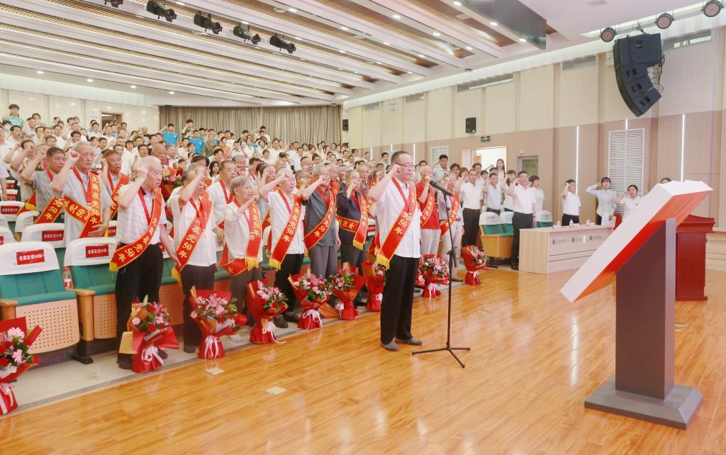 大会首先进行“光荣在党50年”纪念章颁发仪式。校长刘永亮同志宣读了荣获“光荣在党50年”纪念章党员名单,校领导惠朝阳、刘永亮、康强、刘清为老党员代表逐一佩戴纪念章,青年学生向老党员献花。“光荣在党50年”纪念章获得者代表周宪武同志作了满怀深情的发言,回顾了自身工作经历,表达了对党的深厚情感、对获得荣誉的光荣自豪和继续为党的事业增光添彩的坚定决心。樊胜军同志带领全体与会人员面向党旗宣誓,再次向党庄严承诺:在任何时候、任何地点、任何场合都不忘入党初心,永远坚定不移跟党走。