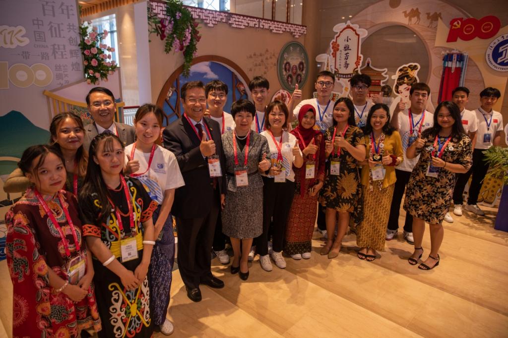 中国教育国际交流协会会长、教育部原副部长刘利民、教育部国际合作与交流司司长刘锦参观文化展示墙并与学生合影