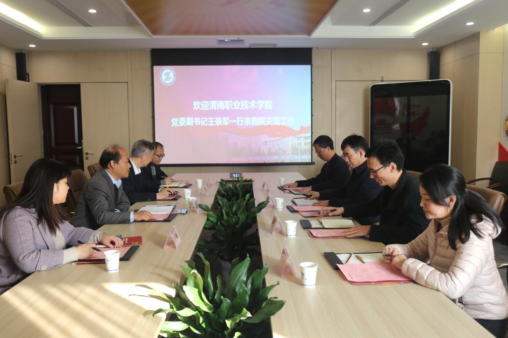 会上,梅创社副校长对王录军副书记一行的到来表示欢迎,在观看完学校宣传片后,从办学规模、师资建设、人才培养、专业建设、国际合作等五个层面介绍了我校的发展情况,对学校双高建设、继续教育与美育工作情况作了详细介绍。王录军副书记对我校的热情接待表示感谢,他提到,两校的交往有深厚历史渊源,对我校近年来取得的办学成绩给予高度评价,介绍了渭南职业技术学院的基本情况与发展特色。随后,付胜利部长以“化美育德 艺技融合”为题,分别从美育工作概况、美育工作理念、美育课程开设与实践活动等方面,系统性介绍了我校美育工作的情况。最后,双方就美育工作组织架构、课程与场地建设、活动开展等问题进行了深入细致的交流。