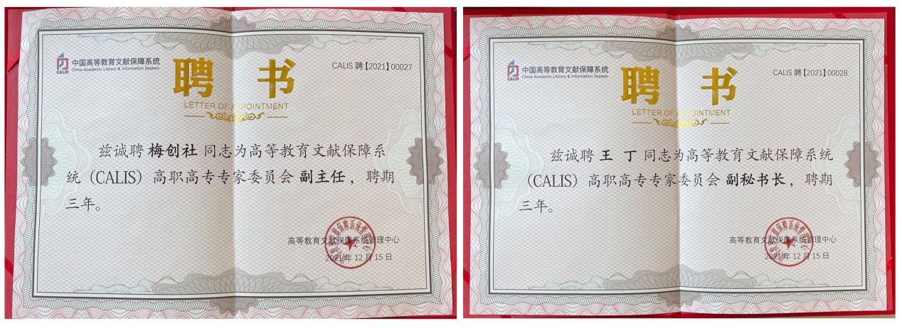 我校副校长梅创社被聘为CALIS专家委员会副主任,图书馆副馆长王丁被聘为副秘书长,聘期三年。在12月18日召开的2021年陕西省高职图书馆年会上,教育部中国高等教育文献保障系统(CALIS)管理中心主任助理、事业发展中心主任许长城为我校受聘的两人发放聘书。