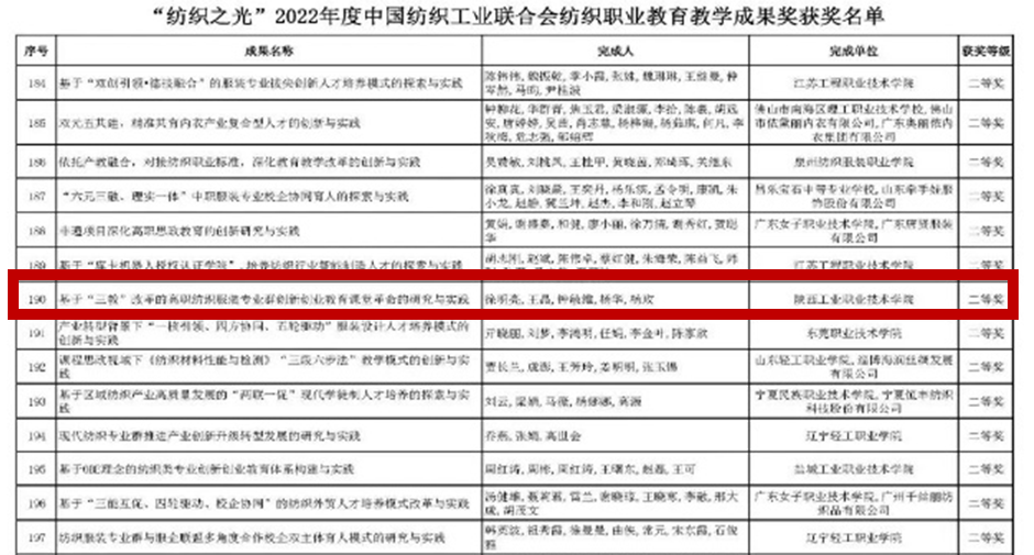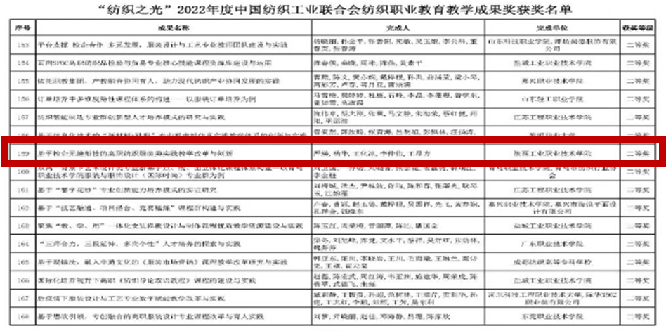 根据国务院发布实施的《教学成果奖励条例》和《中国纺织工业联合会纺织职业教育教学成果奖励办法》,经中国纺织工业联合会纺织教育教学成果奖励评审委员会审定,经中国纺联批准, “纺织之光”2022年度中国纺织工业联合会纺织教育教学成果奖授奖项目共计206项, 获得特等奖的奖励金由纺织之光科技教育基金会资助。本教育教学成果奖的设立旨在鼓励纺织服装院校积极深化教学改革,彰显“做中学、学中做”的纺织教育教学改革特点, 开拓创新, 提高纺织教育教学水平和教育质量,全面促进和推动纺织行业发展。