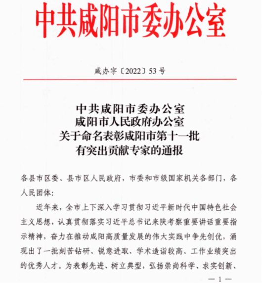 近日,中共咸阳市委办公室、咸阳市人民政府办公室下发《关于命名表彰咸阳市第十一批有突出贡献专家的通报》(咸办字〔2022〕53号),我校教师付胜利、胡平荣获“咸阳市第十一批有突出贡献专家”荣誉称号。