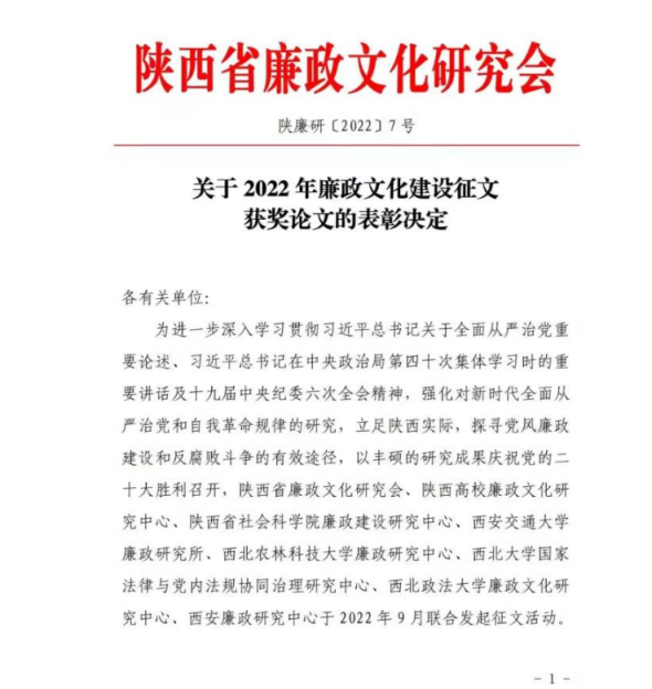 据悉,本次征文活动由陕西省廉政文化研究会、陕西高校廉政文化研究中心、西安廉政研究中心联合5所高校廉政建设研究中心举办,共收到论文208篇,经专家评审小组联评,共评出获奖论文132篇。