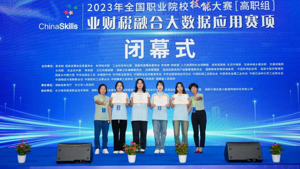 2023年7月22日至24日,2023年全国职业院校技能大赛(高职组)“业财税融合大数据应用”赛项在长沙商贸旅游职业技术学院成功举办。本赛项为团体赛,全国31个省共95支队伍380人参赛,每队4人,是全国职业院校技能大赛大规模赛项之一。经过两天的激烈竞争,由我校财经与旅游学院杨红、常明明老师指导的大数据与会计专业秦宁宁、梁心茹、王菲茹、马艳红同学组成的代表队斩获团体三等奖,实现了该专业在学生技能大赛国赛零的突破。