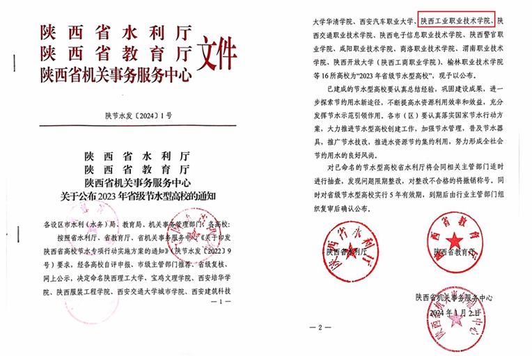 近日,陕西省水利厅、陕西省教育厅、陕西省机关事务服务中心联合印发《关于公布2023年省级节水型高校的通知》(陕节水发[2024]1号),经自评申报、市级主管部门推荐、省级复核、网上公示,我校获评“2023年省级节水型高校”。