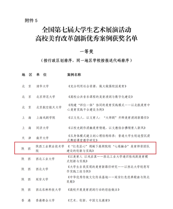 同日下午,美育改革创新案例报告会上,我校美育部部长付胜利以《“红色匠心”视域下高职院校“七炼融合”美育师资团队建设的创新与实践——以陕西工业职业技术学院为例》为题,从师德锤炼、课堂修炼、青蓝砺炼、研创淬炼、实践锻炼、内外合炼、机制熔炼七个方面展示了学校美育师资建设的成果,受到与会专家的充分肯定,获得高校美育改革创新优秀案例一等奖。近年来,我校重视美育师资团队建设,美育师资队伍2022年被评为陕西省第十届“陕西好集体”,并被《中国青年》杂志专版报道。