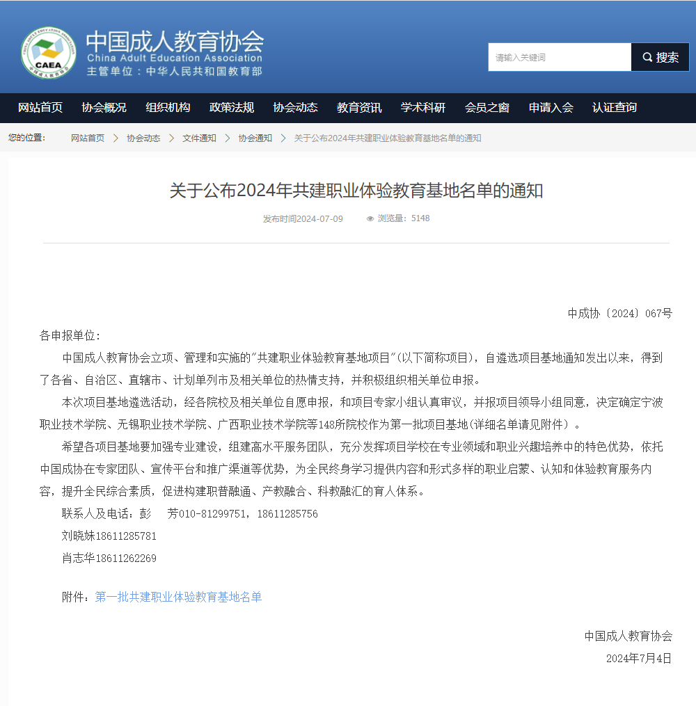 近日,中国成人教育协会公布了第一批“共建职业体验教育基地”名单,我校成功入围。