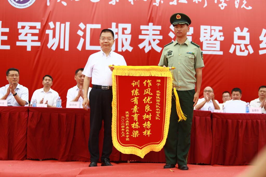 最后,党委书记惠朝阳向武警陕西总队机动支队领导赠送锦旗。在两校区,党委书记惠朝阳、校长刘永亮分别宣布2024级学生军训正式闭营。