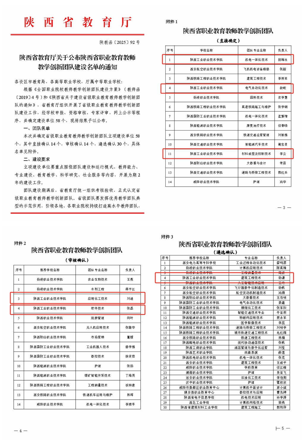 近日,省教育厅公布陕西省职业教育教师教学创新团队建设名单,我校6支团队成功入选,数量位居全省高职院校首位,彰显了学校在师资队伍建设领域的实力,为学校教育教学高质量发展注入强劲动力。