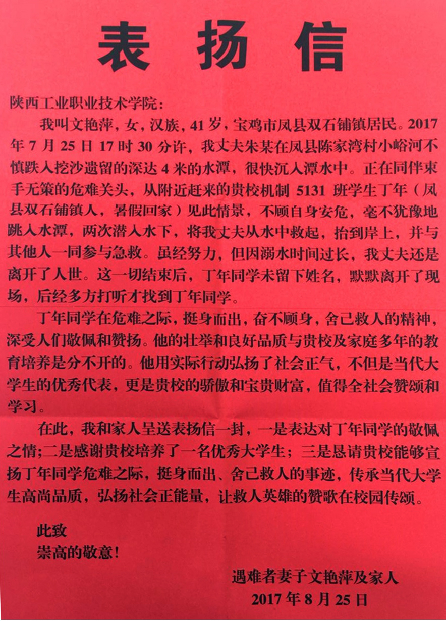开学初,我院收到宝鸡市凤县双石铺镇居民文艳萍女士专程递来的一封表扬信,对机械工程学院机制5131班丁年同学在危难之际见义勇为,奋不顾身勇救落水者的义举表示感谢。