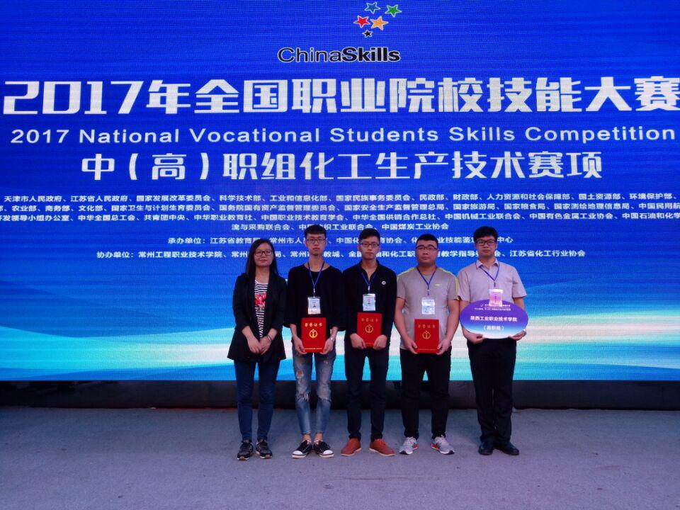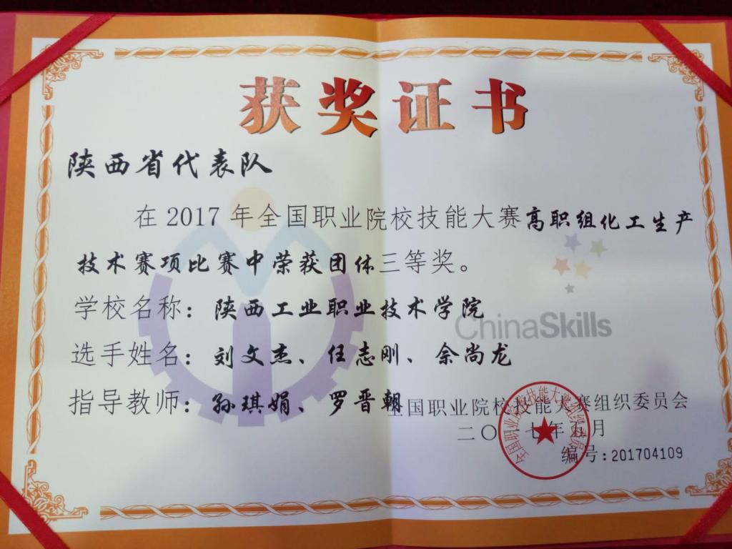 6月1至6日,全国职业院校技能大赛化工生产技术赛项(高职组)比赛在常州工程职业技术学院举行,比赛吸引了全国30个省、市、自治区的43所高职院校参加。由我院化工1501班刘文杰、化工1502班任志刚、化工1503班佘尚龙三位同学组成的参赛队在领队赵明威,指导教师孙琪娟、罗晋朝的指导下,代表陕西省参赛并荣获团体三等奖,三位选手都获得全国职业技能鉴定中心颁发的化工总控工高级工证书。