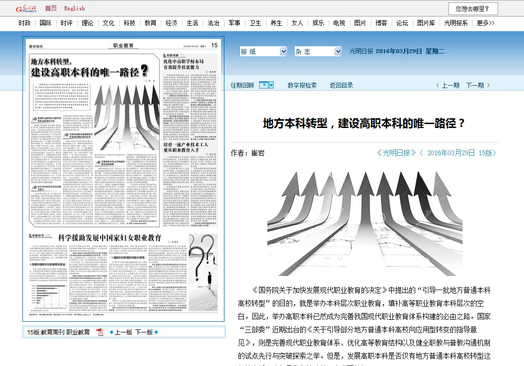 3月29日,《光明日报》在其“职业教育”版(15版)刊发我院党委书记、陕西省职教学会会长崔岩教授的专题文章。崔岩教授的文章以《地方本科转型,建设高职本科的唯一路径?》为题,从四个维度探讨了发展高职本科,完善高等职业教育体系的趋势和走向,现将全文转载如下: