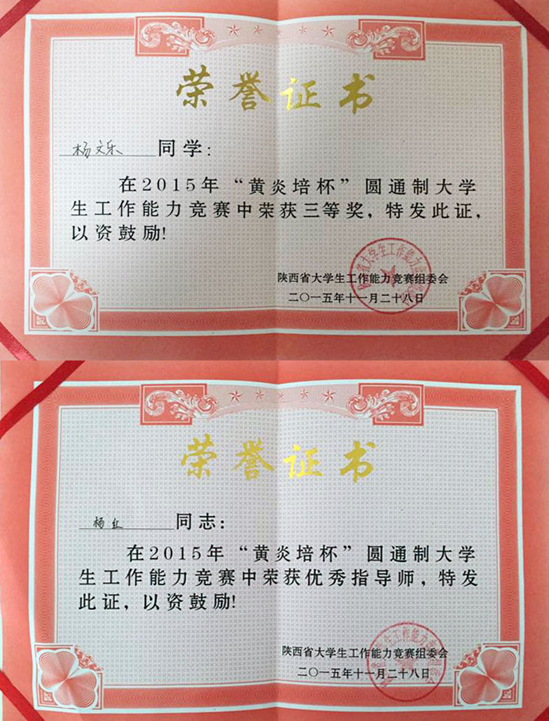 11月28日,2015年陕西省“黄炎培杯”圆通制大学生工作能力竞赛总决赛在西安举行。我院工商管理学院选派了会计1401班杨文乐、贺美玲、柏婉婷等同学组成的五人参赛团队(指导教师:杨红)首次参加该赛事,取得了团体三等奖1项,个人三等奖1项的优异成绩,杨红同志还被评为“优秀指导师”。