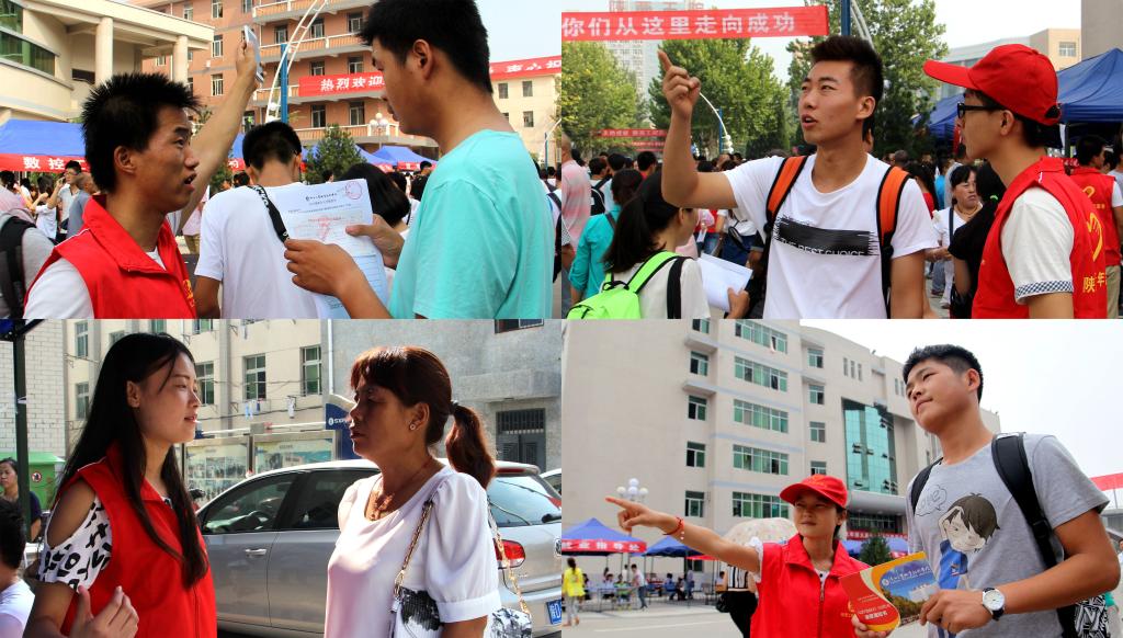 2015级迎新工作的志愿者队伍由团委、学生会、社团联合会直属的学生干部及各二级学院抽调的党团员青年组成。为了让新生和家长在报到时有头绪,从咨询到录入再到填写学生信息等都有详细的引导牌,各学院都做好精心的准备,在每个地点都派有专门的大学生志愿者负责帮助。