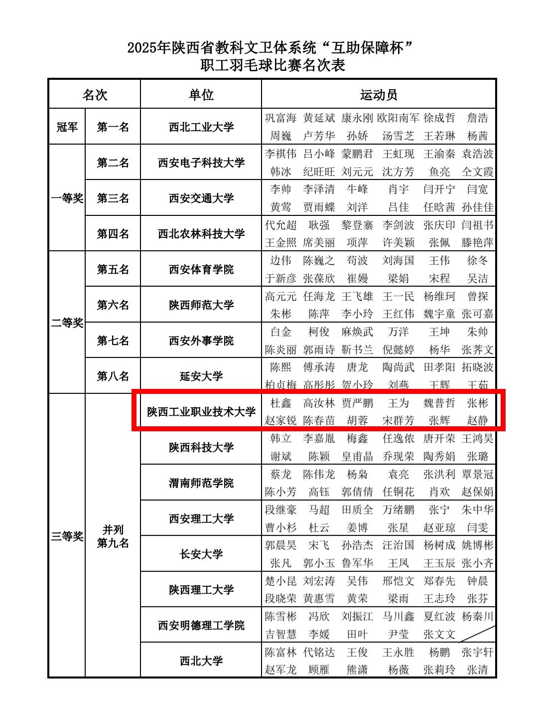 10月31日至11月2日,“中国梦·劳动美——凝心铸魂跟党走 团结奋斗新征程”2025年陕西省教科文卫体系统职工羽毛球比赛在西北农林科技大学落幕。本次赛事由陕西省教科文卫体工会主办,西北农林科技大学承办,吸引了来自全省教科文卫体系统57家单位代表队的800余名领队、教练员和运动员参赛。我校教职工羽毛球队凭借出色的发挥以及顽强拼搏的精神,荣获三等奖,也是唯一一名进入16强的高职院校,展现了我校教职工良好的精神风貌和竞技水平。