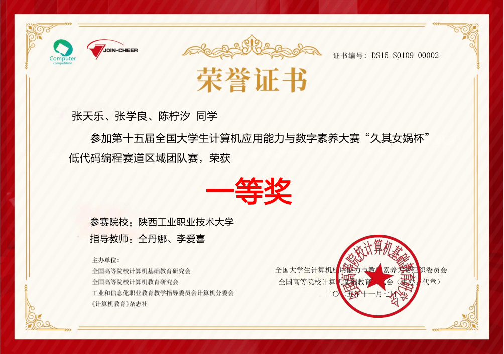 11月16日,第十五届全国大学生计算机应用能力与数字素养大赛2025年“久其女娲杯”低代码编程大赛全国总决赛在重庆举行,我校大数据与会计专业张天乐、张学良、陈柠汐3名同学组成的参赛队获团体二等奖。