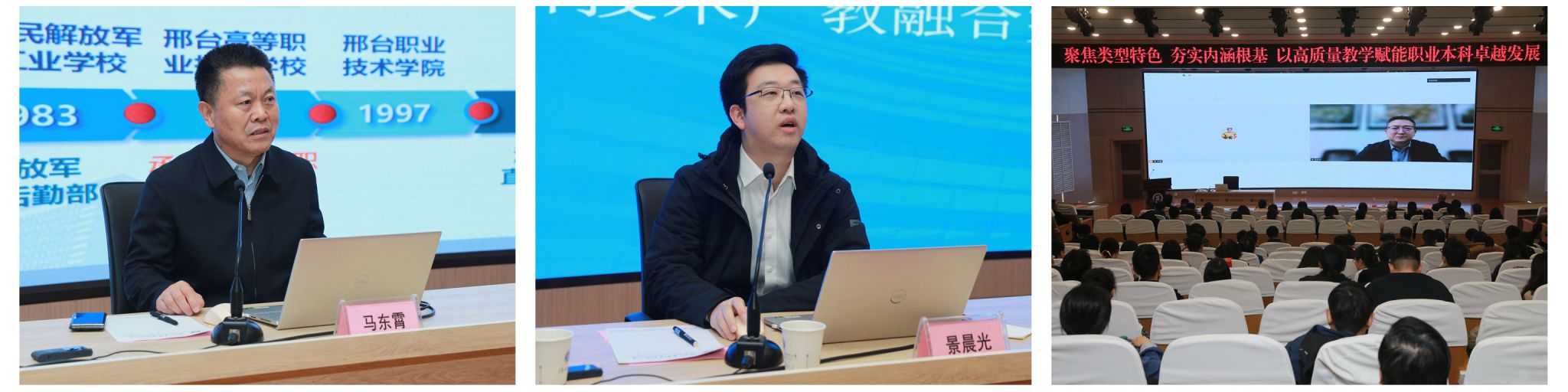 会议特邀三位校外专家分别作专题报告。河北科技工程职业技术大学党委书记马东霄以《高质量推进职业本科建设的思考与实践》为题,结合丰富的院校管理经验与实践案例,对职业本科教育的发展规律与创新路径进行了深度解读;深圳市汇川技术股份有限公司校企合作总监景晨光分享了题为《赋能中国智造 共筑人才新生态——汇川技术产教融合实践与展望》的报告,从产业视角剖析了新质生产力背景下的人才需求与校企合作新生态;陕西学前师范学院副校长王彬武通过线上方式,作了《人工智能时代教师观念的重塑》专题报告,深入阐述了数字化转型背景下教师角色转型与观念更新的紧迫性与实践路径。三场报告高屋建瓴、内容翔实,为我校探索职业本科建设路径提供了宝贵的理论指导、产业洞察与前沿思考。