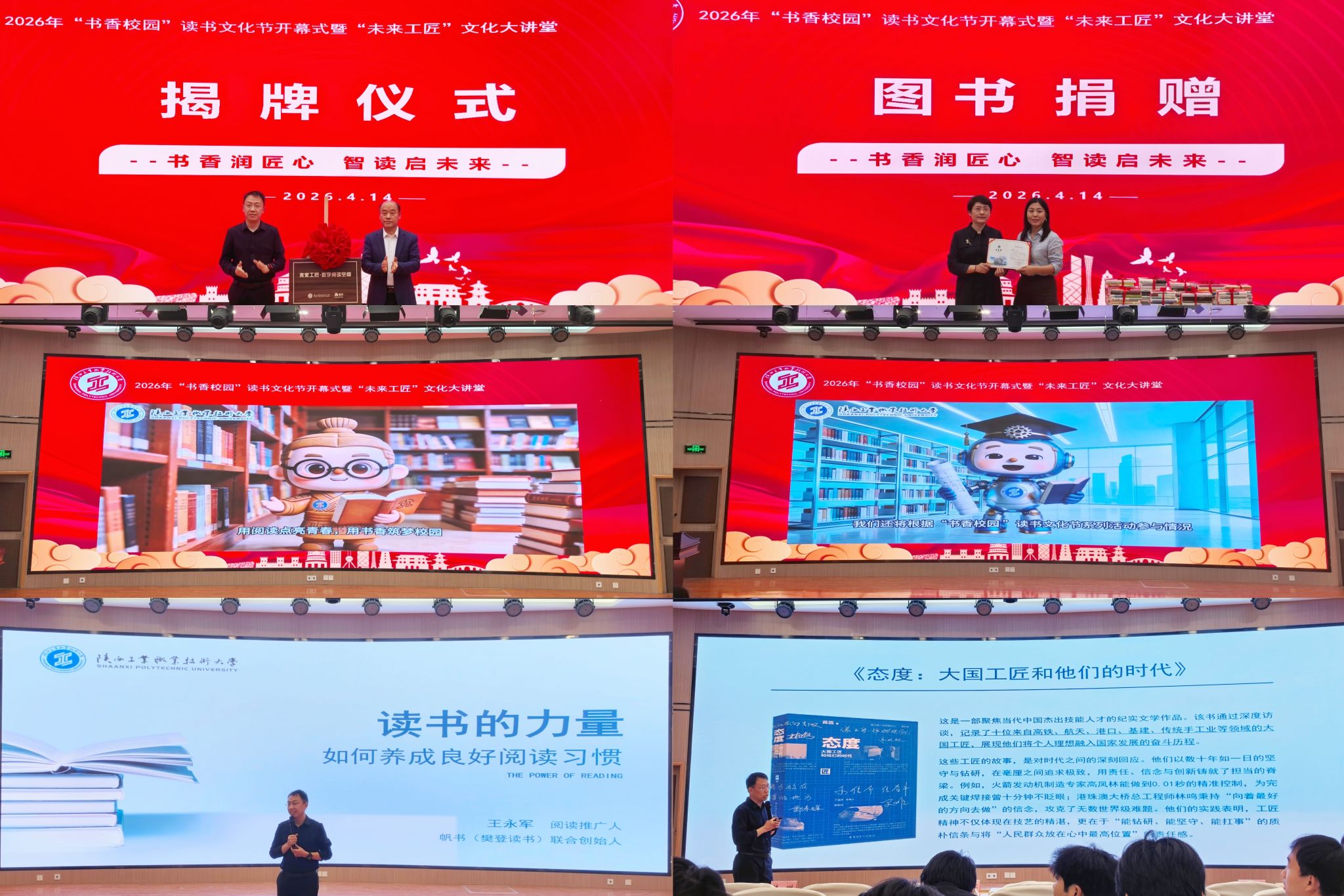 芳菲四月,墨韵书香;薪火赓续,匠心筑梦。4月14日下午,2026年“书香校园”读书文化节开幕式暨“未来工匠”文化大讲堂活动在渭城校区学术会堂举行。副校长梅创社,樊登读书联合创始人王永军,帆书高校推广部负责人韩琳出席活动,开幕式由图书馆馆长王丁主持。