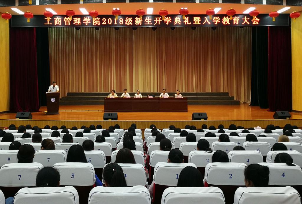 9月7日上午,工商管理学院在明德堂礼堂举行2018级新生开学典礼暨入学教育大会,工商管理学院党总支书记孙继龙、院长韩文飞、副院长吴珊娜、学工办主任杜娟、教学办主任赵利娟、实训中心主任张联朋、2018级辅导员吕华以及790余名新生参加了会议,会议由党总支书记孙继龙主持。
