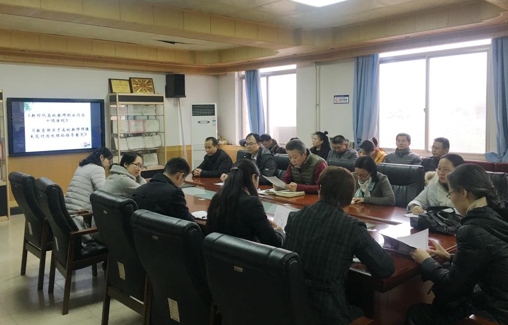 12月10日下午,工商管理学院召开全体教职工会议,组织学习《新时代高校教师职业行为十项准则》及《教育部关于高校教师师德失范行为处理的指导意见》,会议由工商学院院长韩文飞主持。