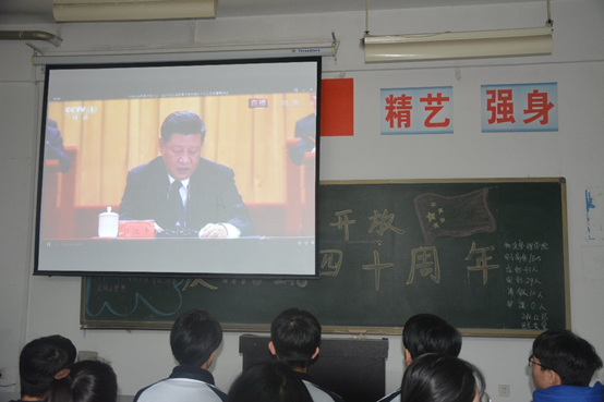 同学们以班级为单位,观看“庆祝改革开放40周年大会”视频,认真聆听习近平总书记在大会上的发言,并结合思政课“让改革创新成为青春远航的动力”这一章节内容,采用“观影-领学-分享”模式进行主题讨论。
