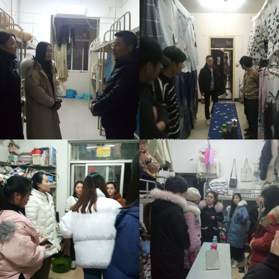 --组织宿舍安全隐患大排查工作。1月6号晚上,信息学院党总支书记闫军带领学工办全体辅导员、班主任、学生干部分为五组,对学院五栋宿舍楼、400多间宿舍进行了全面的安全隐患大排查。检查组重点检查了学生宿舍卫生、安全用电以及防火防盗等情况,提醒学生们要多了解传染病防控知识,加强体育锻炼,同时一定要提高安全隐患意识、增强安全防范和卫生意识,严防火灾和人身意外伤害事故的发生。检查过程中,排查小组对各宿舍安全隐患进行了详细记录,及时提出整改要求,排查结束后对本次安全隐患排查工作进行了总结。
