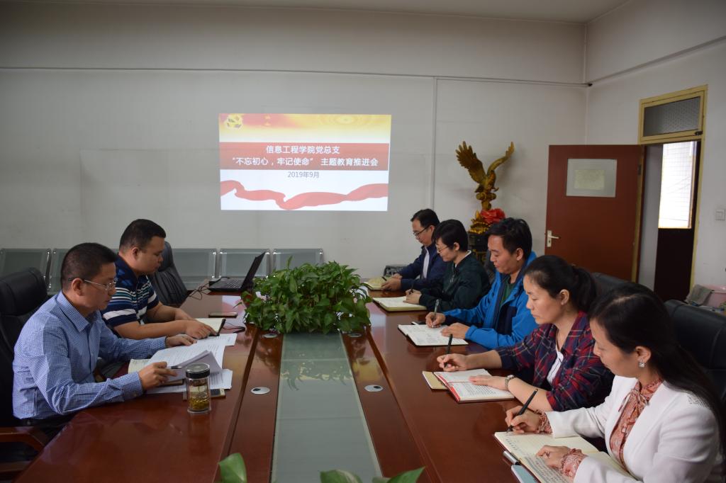 9月24日上午,信息工程学院党总支在崇文楼806召开“不忘初心、牢记使命”主题教育推进会,信息工程学院科级以上干部,总支、支委成员参加会议,总支书记闫军主持推进会。