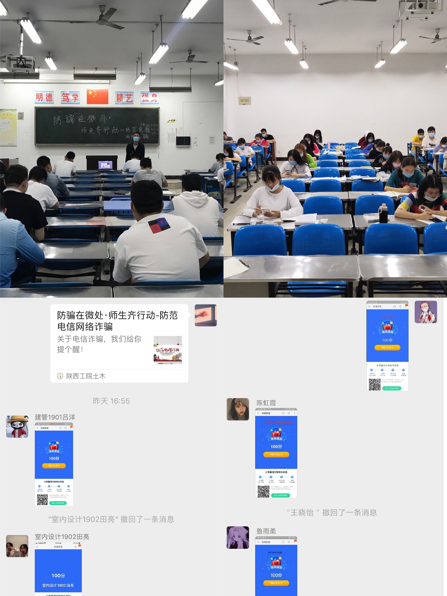 为遏制电信网络诈骗高发态势,提升广大师生员工防范电信网络诈骗意识,有效阻止案件发生,5月24日,土木工程学院组织全体学生参加由阿里巴巴、百城公安推出的主题为“防骗在微处,百城齐行动”的全民互动参与防骗答题活动,并利用晚自习时间组织2018级学生开展防范电信网络诈骗主题班会。