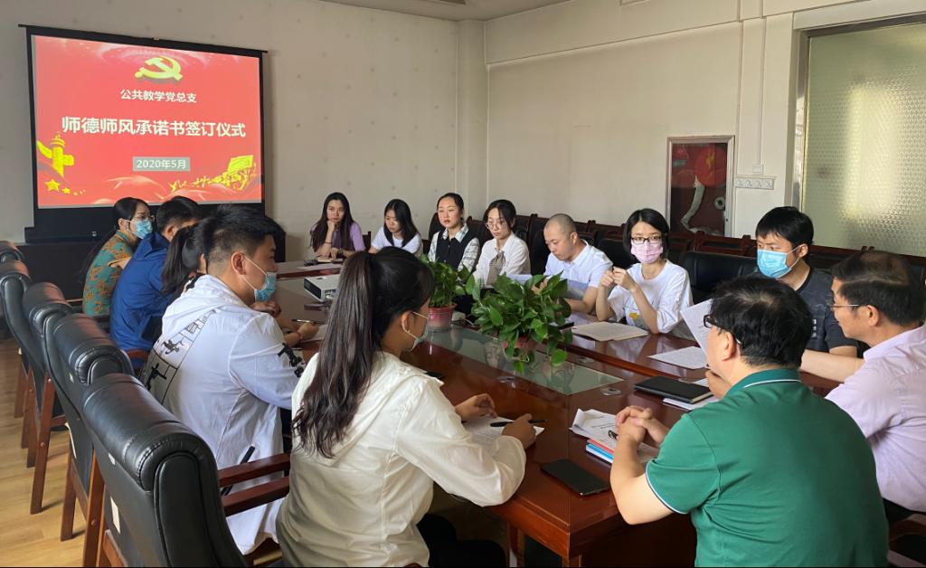 为深入贯彻落实全国全省高校思想政治教育工作会议精神,进一步加强和改进师德师风建设,公共教学党总支于5月28日上午在崇文楼711会议室举行新进教师师德师风承诺书签订仪式。签订仪式由公共教学党总支书记南欢主持,公共教学部、马克思主义学院、体育部、美育部、国际交流中心等部门的12名新进青年教师参加。