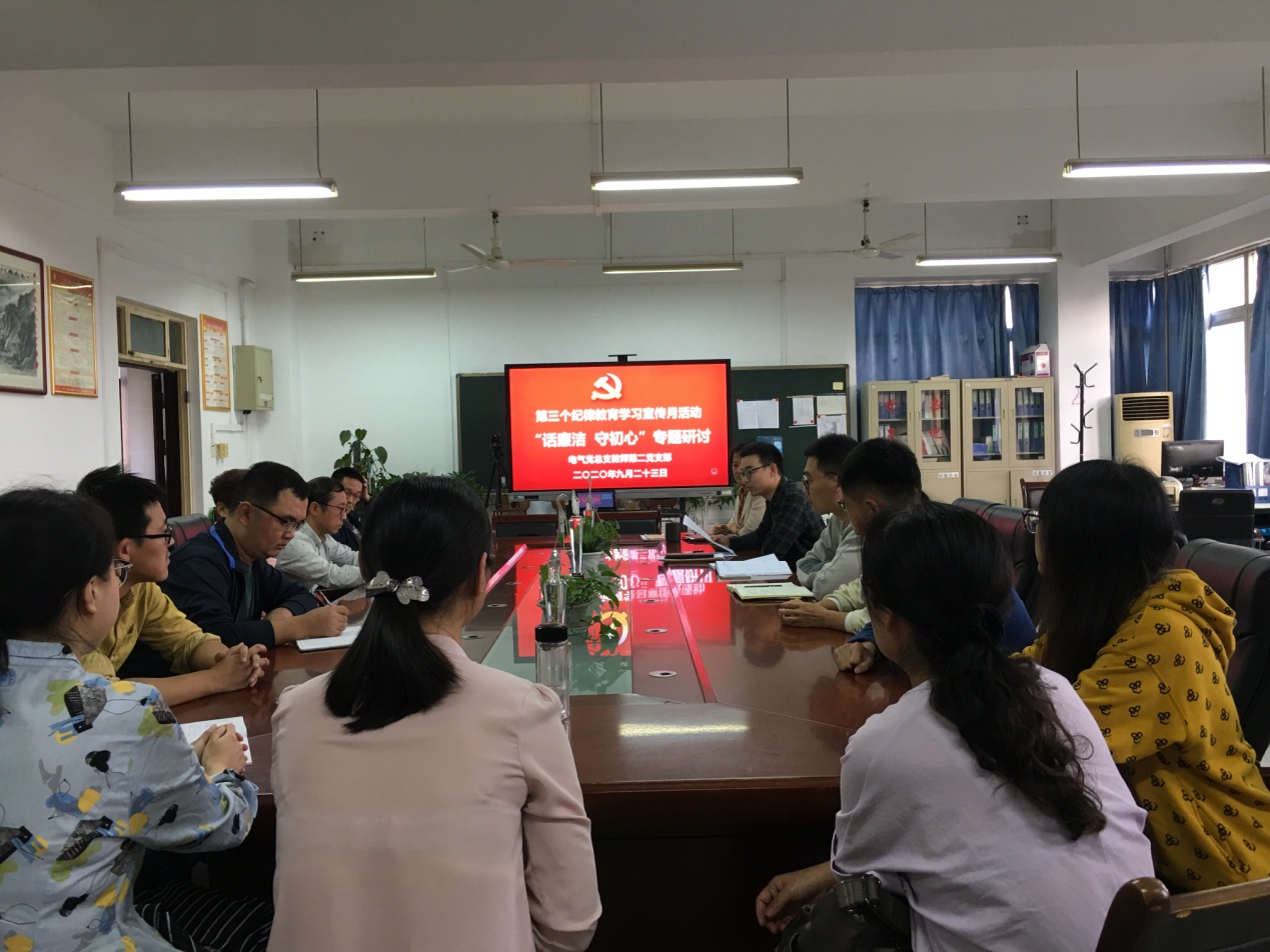 按照《关于开展第三个纪律教育学习宣传月活动的通知》文件精神以及《电气党总支开展第三个纪律教育学习实施方案》具体安排,9月23日下午,电气党总支教师第二党支部开展了“话廉洁、守初心”专题研讨,活动由支部书记张维主持。